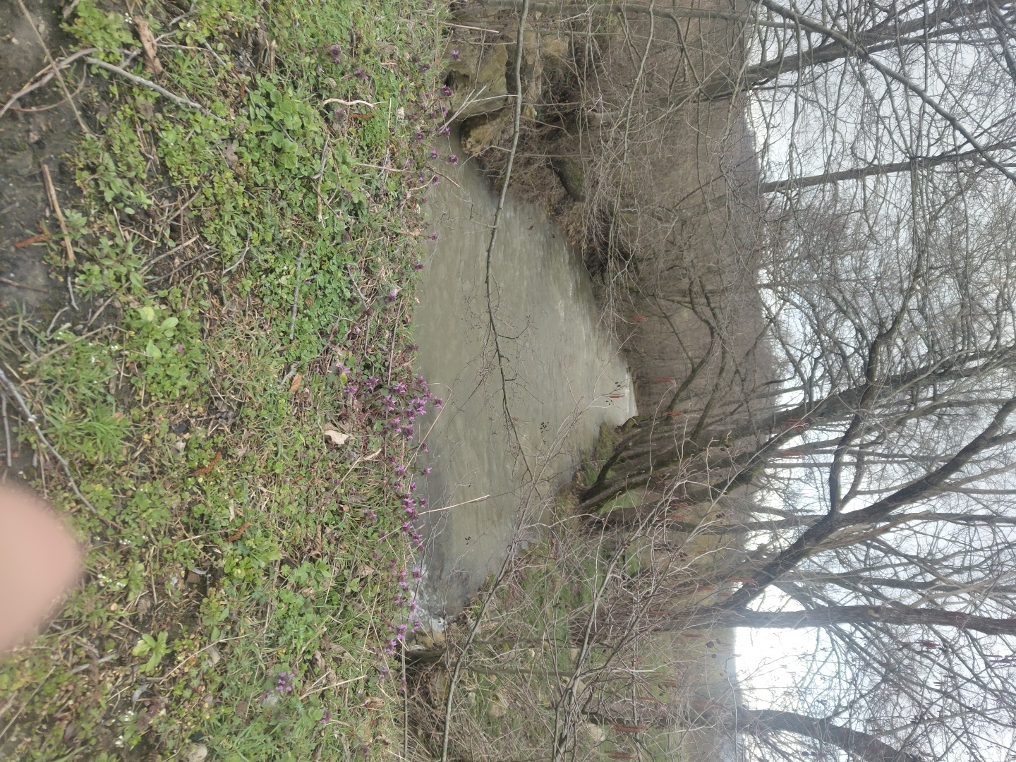 The image depicts a natural riparian landscape in Bojevtsi, Bulgaria, likely during late winter or early spring. A moderately flowing river, characterized by murky, greenish-brown water, occupies the central portion of the scene, receding into the background. The riverbanks are heavily wooded with numerous bare deciduous trees, displaying intricate networks of branches against an overcast, light gray sky. Some branches exhibit reddish-brown catkins or buds. The immediate foreground shows an area of mixed green ground cover, dry grass, and patches of bare soil. Several clusters of small, purple, tubular flowers, consistent with Dead-nettle (Lamium purpureum), are visible along the river's edge. Distant hills, also largely deforested or covered with bare trees, are discernible through the tree canopy in the background. A blurred human finger partially obstructs the lower right corner of the frame. No people or specific actions are observed within the scene.