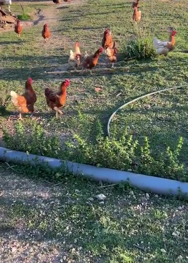 flock of chickens in a grassy field on what appears to be a farm. The chickens are mostly brown with red combs, and they are walking around and pecking at the ground. There is a white chicken amongst them. There is a grey pipe lying on the ground near the bottom of the screen. In the background, there are trees, a fence, and some metal barrels. The lighting suggests it is late afternoon or early morning.