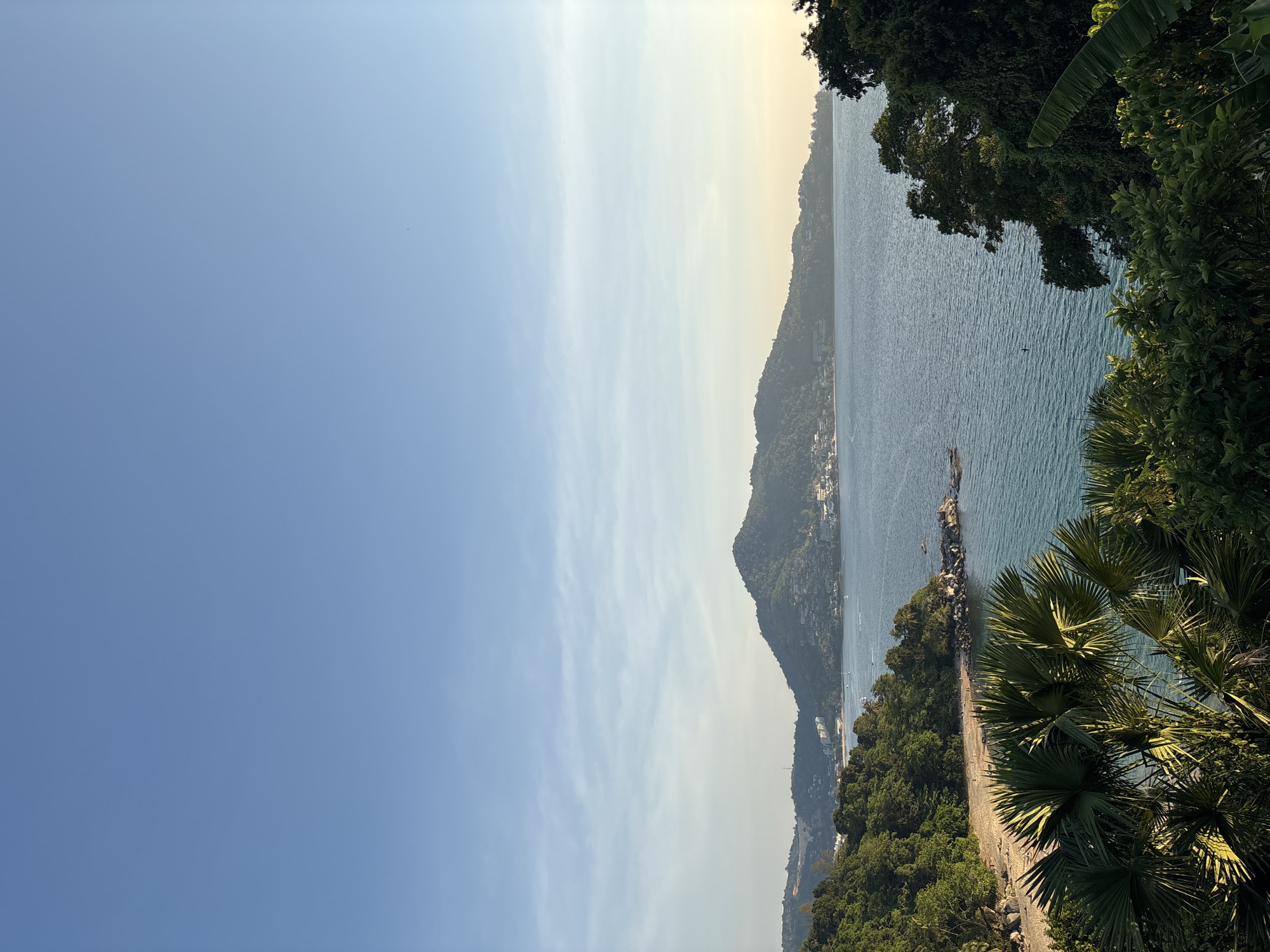 The image depicts a coastal scene in Ban Bang Thao, Thailand, featuring a view from an elevated position overlooking the ocean. Lush, tropical vegetation, including palm trees and various leafy plants, frames the right side of the image. The ocean extends towards a distant landmass, with a hilly landscape visible across the water. A section of rocky coastline is present in the middle ground. The sky transitions from a clear blue at the top left to a slightly hazy or brighter hue near the horizon. There are no people visible in the shot.