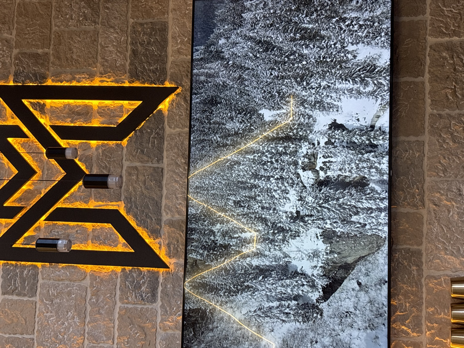 The image displays an interior wall in Kolašin, Montenegro, constructed from light-toned, rough-hewn stone blocks. A large, black, stylized "M" or geometric symbol is mounted on the upper wall section, backlit by a bright orange-yellow LED light strip that illuminates its perimeter. Three small, black cylindrical pendant lights with clear lower sections hang from various points within this illuminated symbol. Directly below, a wide flat-screen television is mounted, displaying a winter landscape. This landscape features a dense forest of snow-covered coniferous trees and a prominent rocky cliff face in the lower-left area of the screen. A thin, golden-yellow, zigzagging line is graphically overlaid across the displayed landscape. The lower portion of the image shows more of the stone wall, with the tops of three metallic, cylindrical objects partially visible in the bottom-left corner. No individuals are present.
