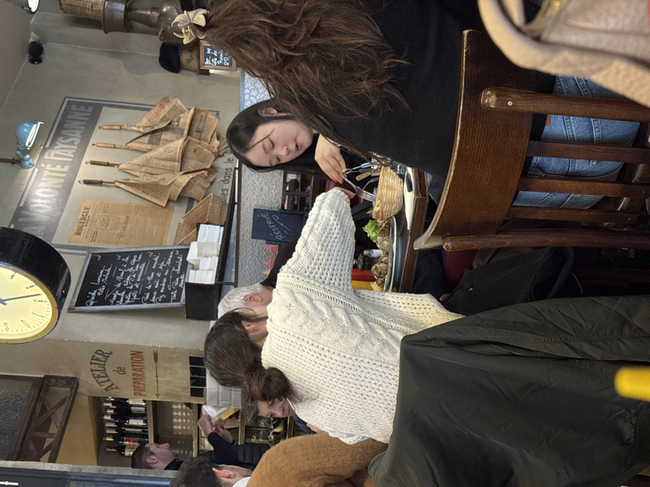 The image depicts the interior of a bustling French bistro or restaurant, specifically identified as "A la Volonté du Peuple - Rouergue" located at 16 Rue des Fossés Saint-Jacques, 75005 Paris, France. The scene is captured from a slightly elevated perspective, looking across several dining tables towards a counter and a back wall. The environment features light-colored walls with vintage decor, including a large round clock showing approximately 1:35. A prominent sign above the counter reads "A VOLONTÉ PAYSANNE," and another sign to the left indicates "ATELIER de PREPARATION" with an arrow. A blackboard menu displays handwritten items in French. Various items are visible on shelves and counters, including stacks of white dishes, baskets, and bottles. Several pieces of folded paper or fabric are decoratively hung on the back wall. In the mid-ground, a person with dark hair tied in a bun, wearing a cream-colored cable-knit sweater, is seated at a dark wooden table, actively cutting food on a plate with a fork and knife. The plate contains what appears to be roasted meat or poultry with a green garnish. Adjacent to them, on the same table, is a small basket of bread and condiment bottles (red and yellow caps). To their right, a young East Asian female with long dark hair, wearing a dark top, is also seated and engaged in eating with a fork and knife. Partially visible in the foreground right is the back of a person with long, wavy dark hair, wearing a dark top and a light-colored hair accessory. Further to the left, a person in a brown/tan sweater is partially visible. In the background, behind the diners, a male restaurant staff member with short hair, wearing a dark vest over a light shirt, is standing behind a counter with bottles of wine, appearing to handle items. Other patrons are indistinctly visible in the background. The furniture consists of dark wooden chairs and tables.