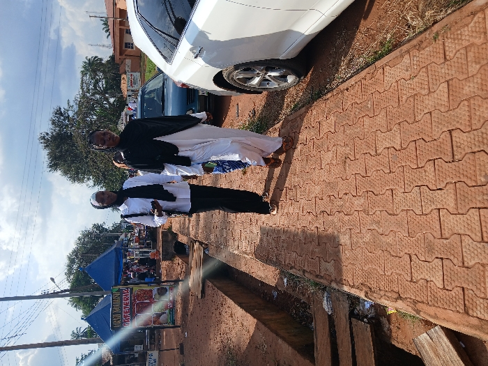 This image captures a street scene in Ayangba, Nigeria, under a partly cloudy sky during daylight hours. In the foreground, a red interlocking paver sidewalk extends diagonally. Three individuals are walking towards the viewer on this sidewalk. The foremost individual on the left is a female wearing a white long-sleeved collared shirt, black trousers, and a black hijab; she carries a dark shoulder bag and holds a dark rectangular object in her right hand. To her right, a second female wears a long white garment and a black hijab, with brown sandals visible. A third individual, partially obscured between the two, wears a blue and white patterned garment. To the immediate left of the sidewalk, an open concrete drainage ditch runs parallel, containing debris and partially covered by wooden planks. Beyond the ditch, a dirt road or shoulder is visible. Further left, two blue canopy tents are erected, with a sign on the left tent reading "MIRAH BOURNISH CAFETERIA" and displaying food images. Utility poles with overhead wires are also visible on the left side of the scene. To the right of the sidewalk, a white four-door sedan (likely a crossover or SUV) is partially visible, with its front right wheel and side prominent on the dirt shoulder. In the background, a dark green sedan is also present. Distant trees and a light-colored building with a red roof complete the background.