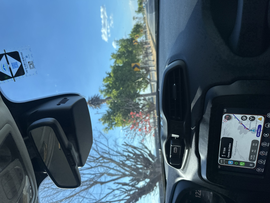The view is from inside a car, looking through the windshield. A rear-view mirror is positioned in the top left. The dashboard is visible with an air vent and a screen displaying a map. The navigation shows that Caseta de Cobro is 11 km away. Trees are visible outside. The sky is blue with some clouds. The display screen shows icons for various applications like radio and media. The number 122 is visible on the dashboard.