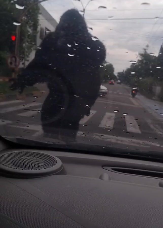 The video is shot from inside a car, looking out through the windshield. Raindrops are visible on the glass. Outside, a person in a gorilla costume is crossing the street at a crosswalk. The traffic light is red. The gorilla is silhouetted against the cloudy sky. Other vehicles and a motorcycle are visible in the background.