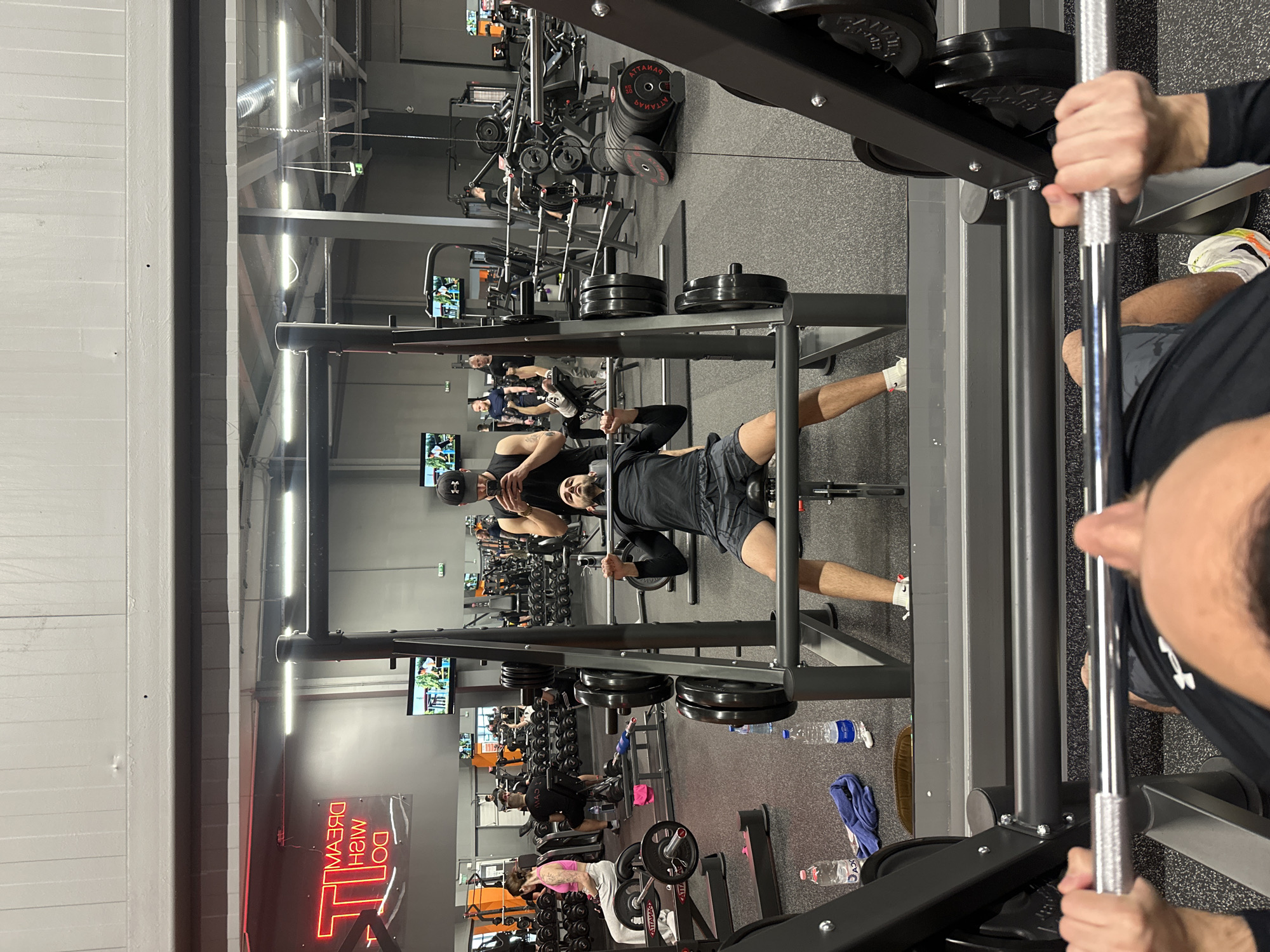 interior of a gym. A man is lying on a weight bench performing a bench press with a barbell. Another man is standing nearby, possibly spotting or assisting him. The gym has various weight machines, free weights, and other exercise equipment. Other people are visible in the background, also working out. A neon sign is visible on the wall. It is not possible to verify that the location is in the city of Plovdiv, Bulgaria.
