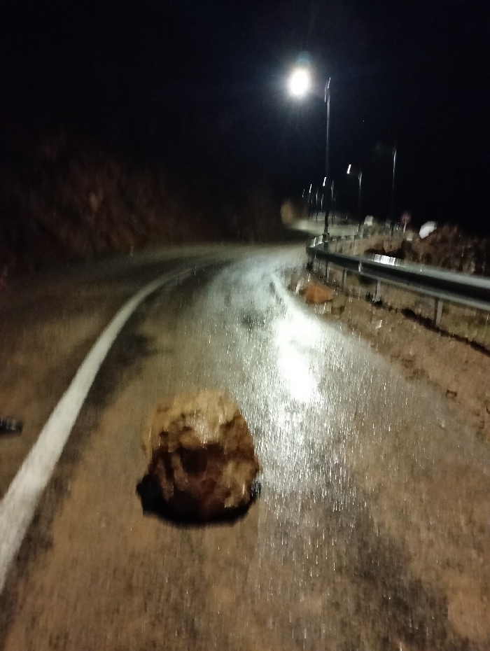 A large rock obstructs a wet, curving road at night. A solid white line marks the road's edge to the left, while a guardrail runs along the road's edge on the right. Streetlights illuminate the scene, reflecting off the slick road surface. Mud and debris are scattered around the rock. The darkness obscures the surrounding landscape, but a hillside is visible to the left.