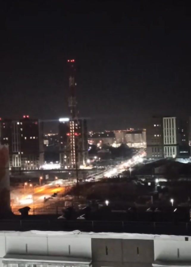 nighttime cityscape with a prominent telecommunications tower. The tower has red lights at the top. Below the tower, there are several modern high-rise buildings with lights on in various windows. In the middle ground, there is a busy road with car headlights and taillights creating bright streaks. In the foreground, there is a light-colored apartment building with windows and a partially visible concrete rooftop. It's dark, and there is a slight snowfall in progress.