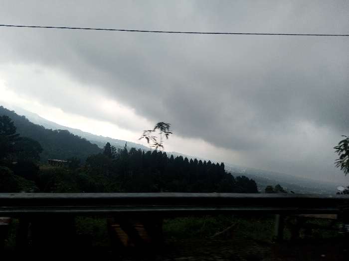 The image displays a wide outdoor landscape in a hilly, forested region near Jabalpur, India, under heavy overcast skies. The upper two-thirds of the frame are dominated by a continuous expanse of dark grey to light grey stratiform clouds, indicative of significant cloud cover and diffused, dim lighting. A thin, dark linear object, consistent with a power line or cable, horizontally traverses the sky in the upper third of the image. A prominent range of densely forested hills or mountains extends across the mid-ground, from left to right, and recedes into the atmospheric haze in the distance. These hills are covered in dark green vegetation, forming a thick canopy. On a slope within this forested area, a small, light-colored structure with a darker roof is partially visible, indicating a man-made presence amidst the natural environment. The lower quarter of the image features a dark, horizontal barrier, appearing consistent with a metal guardrail, suggesting the vantage point is from a road or elevated platform. Below this barrier, the immediate foreground consists of dark, indistinct ground cover with sparse green foliage. A bare branch with a few small leaves extends into the frame from the right side, slightly blurring due to proximity. No individuals, animals, or explicit actions are present within the scene.