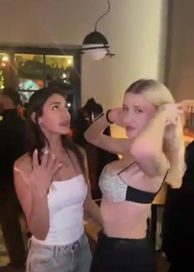 Two young women are dancing in what appears to be a bar or club. The woman on the left has long brown hair and is wearing a white tube top and light wash jeans. The woman on the right has blonde hair, and is wearing a sparkly bra-style top and black pants. They are both smiling and moving to the music, and seem to be having a good time. The setting includes a window with a tree outside, a pendant light, and other people in the background.