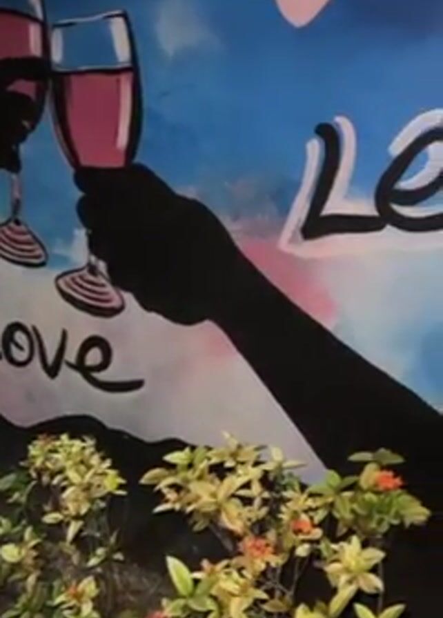 mural on a wall. The mural depicts two silhouetted hands holding up wine glasses in a toast. The wine in the glasses is colored pink. Above the hands and glasses is the word "Lead" in white, graffiti-style lettering. Below the hands and glasses is the word "Love" in a similar style. There are also several heart shapes painted on the mural. The background of the mural is a mix of blue, white, and pink, resembling a sky with clouds. In front of the mural are several plants with yellow and green leaves and small orange flowers. The video is a close-up of the mural, with the camera slowly panning across the scene.