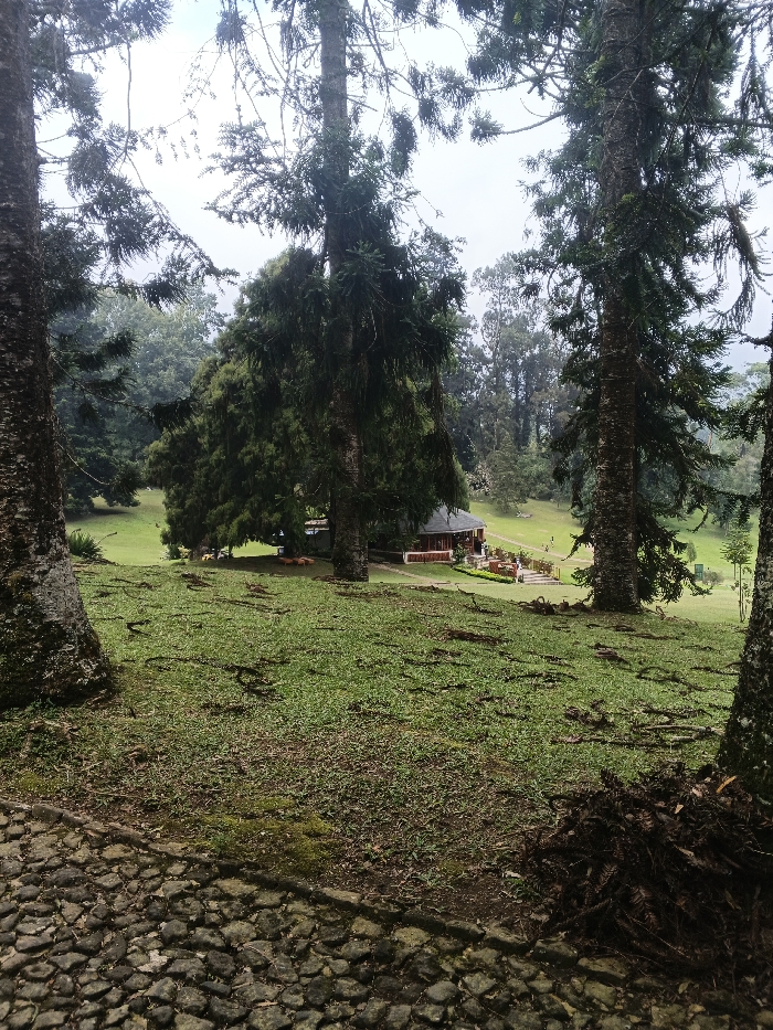The scene depicts a wooded, gently sloping landscape identified as Godawari Botanical Garden in Lalitpur, Nepal, under an overcast sky. A cobblestone path comprises the immediate foreground. Several tall coniferous trees, characterized by dark green foliage and rough bark, frame the view, with exposed root systems visible on the grassy slope. In the midground, a multi-level building, featuring a dark roof, light-colored walls, and a wooden-railed veranda with outdoor seating, is situated amidst trees and an expansive lawn. Several indistinct light-brown animal figures are grouped beneath a large tree to the building's left. Multiple small, indistinct human figures are discernible on the distant grassy slope and on the building's terrace. The background consists of dense forest, receding into a light atmospheric haze.