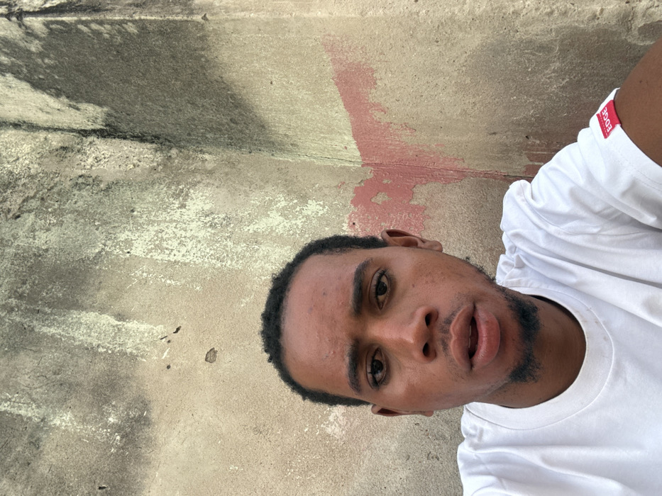 A man with short, dark hair and a light beard poses against a weathered wall. He wears a white t-shirt with a red tag on the sleeve. The wall behind him is a mix of concrete and plaster with patches of red paint. The light is bright, casting shadows on the wall. The man's expression is neutral, his lips slightly parted.