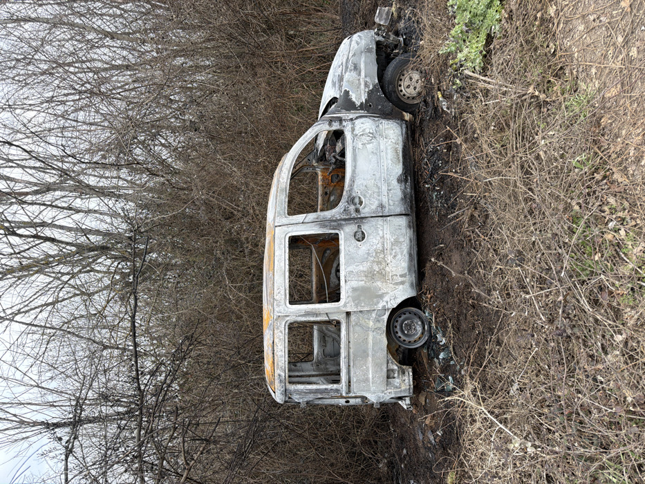 Within Ravadinovo, Bulgaria, a severely burnt light commercial vehicle or van is positioned on disturbed earth adjacent to a dense thicket of bare deciduous trees