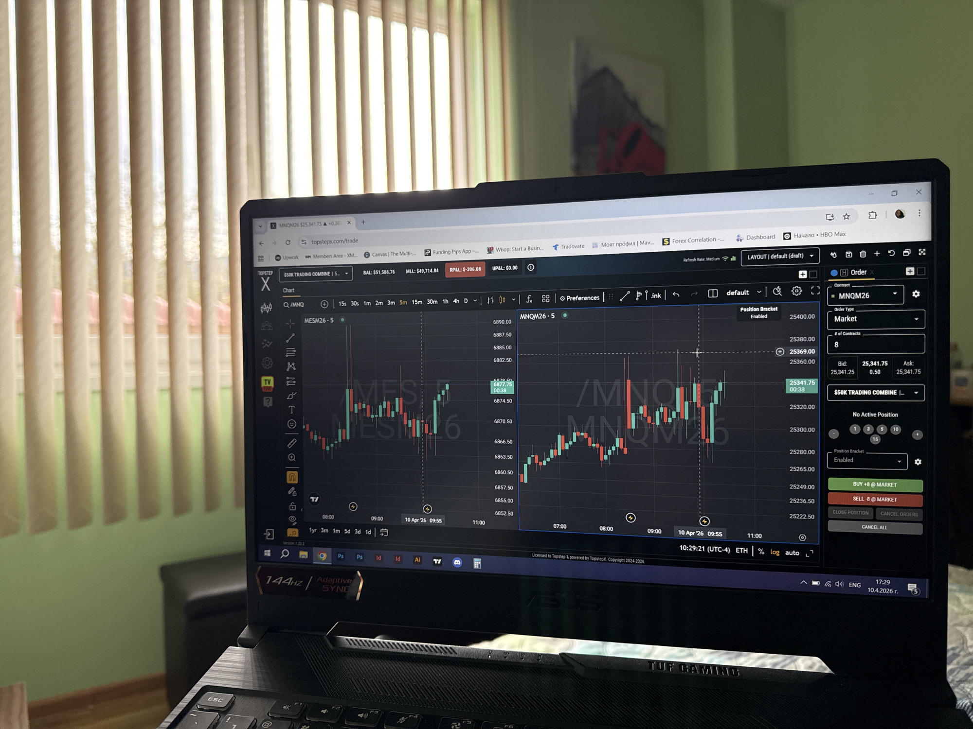 A laptop screen displays trading charts and order entries from Topstep, a proprietary trading firm. The charts show price movements for MESM26 and MNQM26, indicating trading activity in these instruments. An order entry panel on the right side of the screen is set up to trade MNQM26 with a market order of 8 contracts. The laptop is an ASUS TUF Gaming model, visible in the lower left corner. The time on the taskbar shows 17:29 on April 10, 2026, and the trading platform displays 10:29:21 (UTC-4) on April 26, 2026. The laptop is placed indoors near a window with white vertical blinds, suggesting a domestic setting. The wall color visible through the blinds is a muted green. A dark-colored couch or chair is partially visible behind the laptop, further reinforcing the impression of an indoor environment. The scene lacks specific identifying elements to confirm a location in Perushtitsa, Bulgaria.