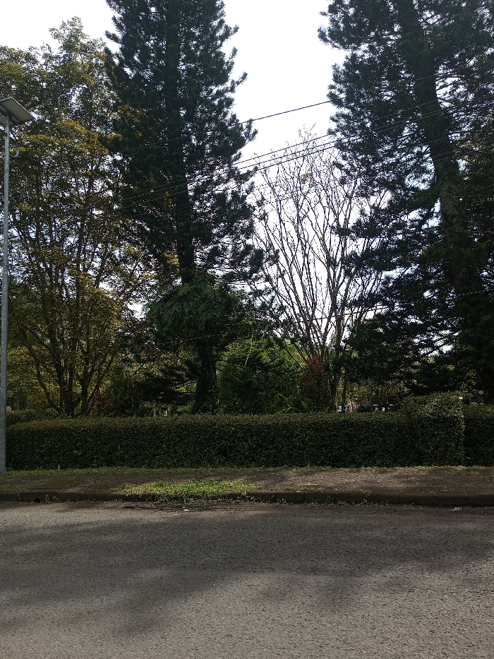 This image depicts an outdoor landscape within the city of Namthoung, Laos, viewed from a slightly elevated perspective towards a green area. The foreground features an asphalt road surface, extending horizontally across the lower third of the frame, exhibiting light and shadow patterns. A concrete curb separates the road from a narrow strip of ground containing sparse grass and dirt patches. Immediately behind this strip is a dense, well-maintained, dark green hedge running horizontally across the mid-ground. Above and behind the hedge, a variety of trees dominate the scene. On the far left, a light pole with a mounted solar panel array is visible, extending vertically upwards. To its right, a tall, slender coniferous tree with dark green foliage stands prominently, partially obscured by the utility pole. Further right, a broad deciduous tree with fewer leaves displays its complex branch structure against the bright sky. Another tall coniferous tree, similar to the first, frames the right side of the image. Numerous other trees and dense green undergrowth are visible throughout the background, filling the space between the prominent trees. Two thin, dark utility wires span horizontally across the upper portion of the frame, visible against the bright, possibly overcast, sky. No individuals, specific actions, or direct interactions are visible within the depicted environment.