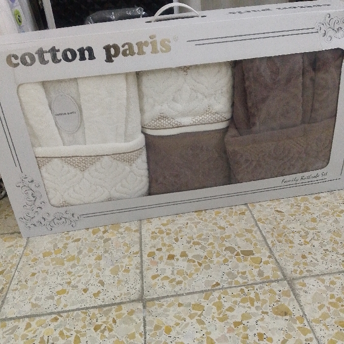 A white rectangular cardboard box, branded "cotton paris" in dark grey lettering and labeled "Family Bathrobe Set," is centered on a light-colored, speckled terrazzo-style tile floor in Baghdad, Iraq