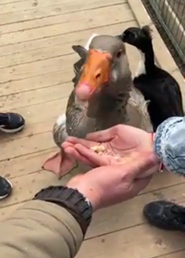 people feeding a gray goose from their hands on a wooden deck