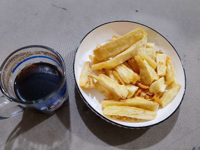 A glass mug of dark liquid sits beside a plate of golden-brown fried yucca