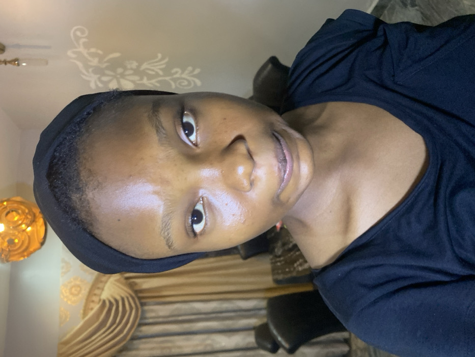A young woman with dark skin and a black headband is photographed indoors. She faces forward, smiling slightly. Her dark eyes are prominent. She is wearing a black top with a scooped neckline. The background includes a wall decoration resembling flowers and a light fixture with a golden glow. Gold-colored curtains are also visible. The image is rotated counter-clockwise.