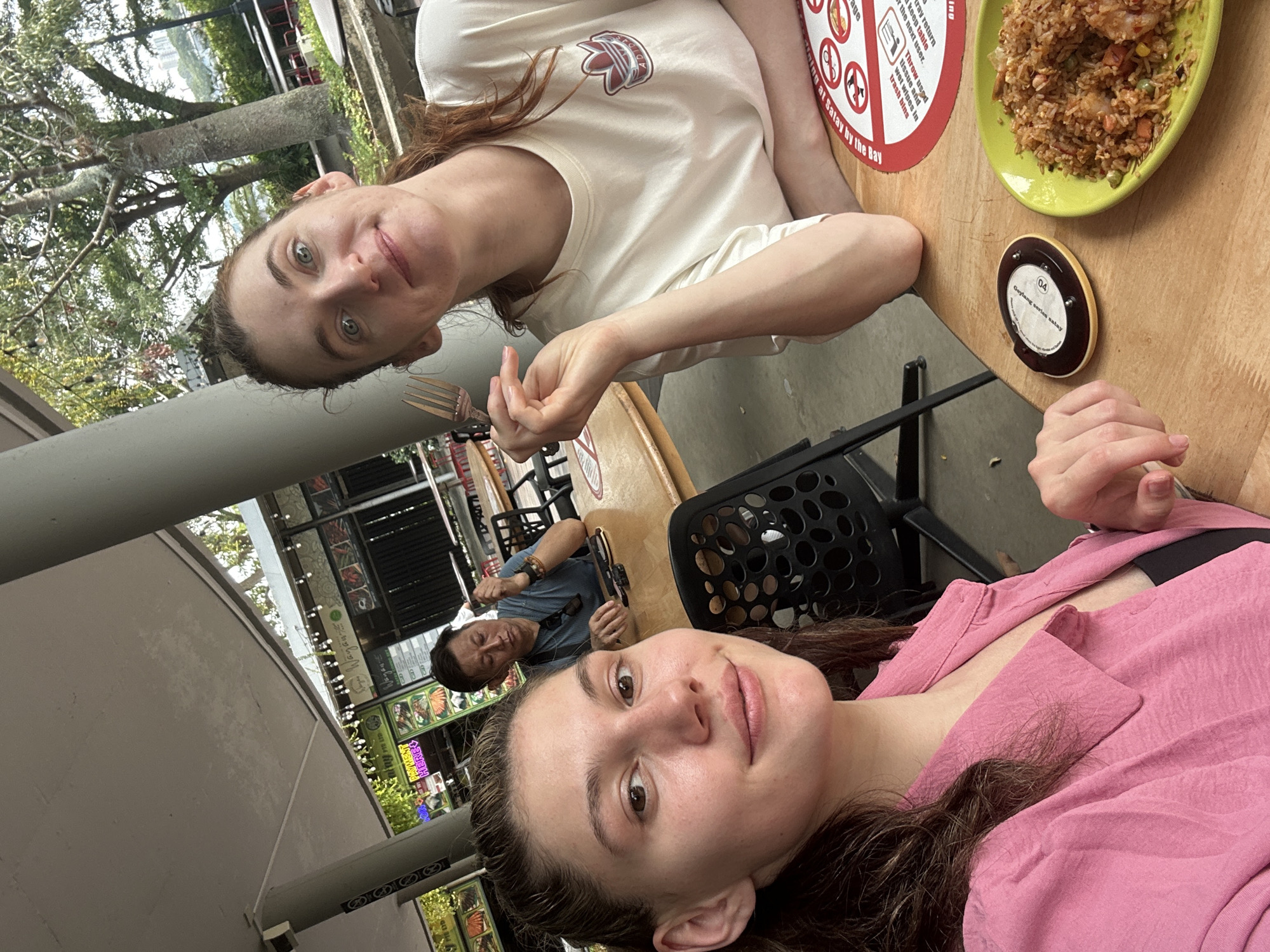 Three individuals are captured in a selfie-style photograph at an outdoor dining area consistent with a hawker center. The location is identified as Satay by the Bay in Singapore, Singapore, based on branding visible on a red circular mat. In the foreground, a young adult female with light skin and dark hair, wearing a pink collared shirt over a black top, looks directly at the camera with a subtle smile. To her right, another young adult female, also with light skin, reddish-brown hair, and an off-white t-shirt featuring a red and silver Adidas logo, holds a silver fork in her right hand, resting it near her mouth, and looks towards the camera with a neutral expression. A plate of fried rice, containing shrimp, peas, and carrots, is positioned on the light wooden table in front of her. Adjacent to the first female is a circular electronic pager labeled "04". In the mid-ground, an adult male of East Asian descent, wearing a blue polo shirt and sunglasses perched on his head, is seated at a separate light wooden table, looking towards his left, away from the camera. The background displays multiple food stalls under a large, light-colored canopy. One stall sign partially reads "Wagyu," and another indicates "PAYMENT HERE." The environment includes trees and distant cityscape structures, suggesting an open-air dining establishment during daylight hours. Black patterned chairs are visible around the tables.