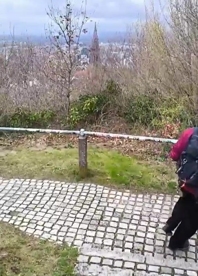 person in a red jacket and dark pants walking down a stone staircase. They are wearing a backpack. The camera follows behind them as they descend. At the bottom of the staircase, the camera pans upward to reveal a cityscape in the distance, partially obscured by trees. A metal railing runs along the edge of a grassy area. The sky is overcast.