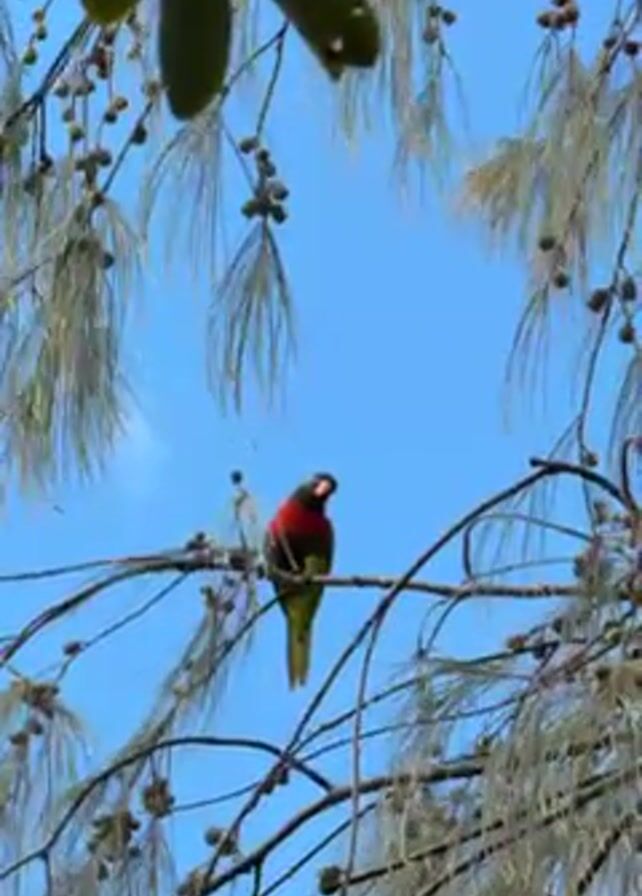 vibrantly colored parrot perched on a branch of a tree. The parrot has a red head and chest, with primarily green plumage on the rest of its body. The tree has slender, pine-like needles and small, round seed pods. The background is a clear blue sky with a few wisps of clouds visible. The camera appears to be looking upwards, capturing the bird and branches from below. There is a hint of larger green leaves at the very top left corner of the frame.