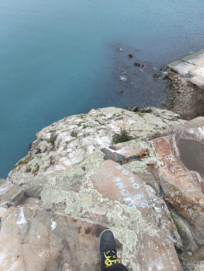 A high-angle view depicts a steep, rocky cliff face overlooking a body of turquoise-blue water in Utios, Ukraine. In the immediate foreground, at the bottom center, the toe of a human foot clad in a dark grey or black shoe with bright yellow laces and a grey sole is visible on the reddish-brown rock surface. The cliff face itself consists of large, stratified rock formations, heavily covered in light green and yellow lichen, with some small patches of dark green vegetation. On a flatter rock surface in the mid-right, blue Cyrillic text "УТЕС 20.04.08" (UTIOS 20.04.08) is painted. Further right, faded red and orange graffiti is also present. The water below reveals scattered submerged rocks and a clear transition to a rocky shoreline on the right, where white-capped waves indicate movement. Concrete structures, including a stepped pathway and a flat platform, are visible at the water's edge on the far right, suggesting a man-made dock or access point.