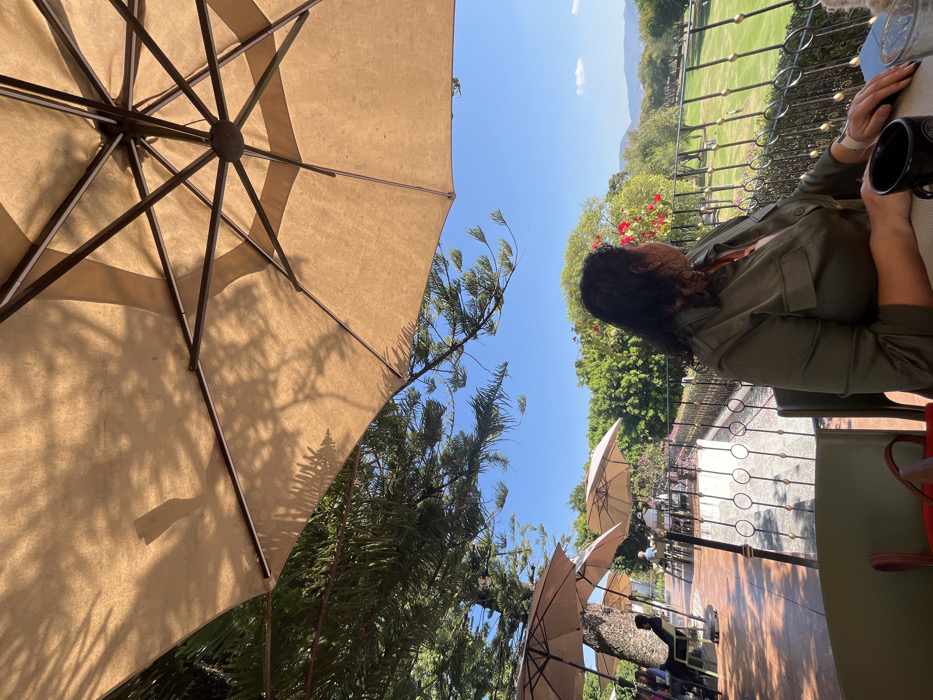 A woman sits at an outdoor table with a black mug in hand. The scene is taken from a low angle, capturing a partial view of a large beige umbrella with visible support struts. Additional umbrellas dot the scene. There is a wrought-iron fence in the background overlooking a grassy area. Green trees and shrubs fill the vista, reaching towards a clear blue sky.