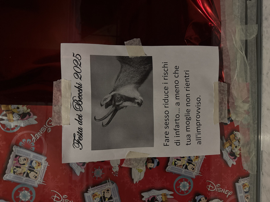 sheet of paper taped to a surface with Disney-themed wrapping paper. The paper features an image of a goat and the text "Festa dei Becchi 2025." Below the image, text reads "Fare sesso riduce i rischi di infarto... a meno che tua moglie non rientri all'improvviso," which translates to "Having sex reduces the risk of a heart attack... unless your wife comes home unexpectedly." It appears to be an invitation or advertisement for a party with a humorous message.