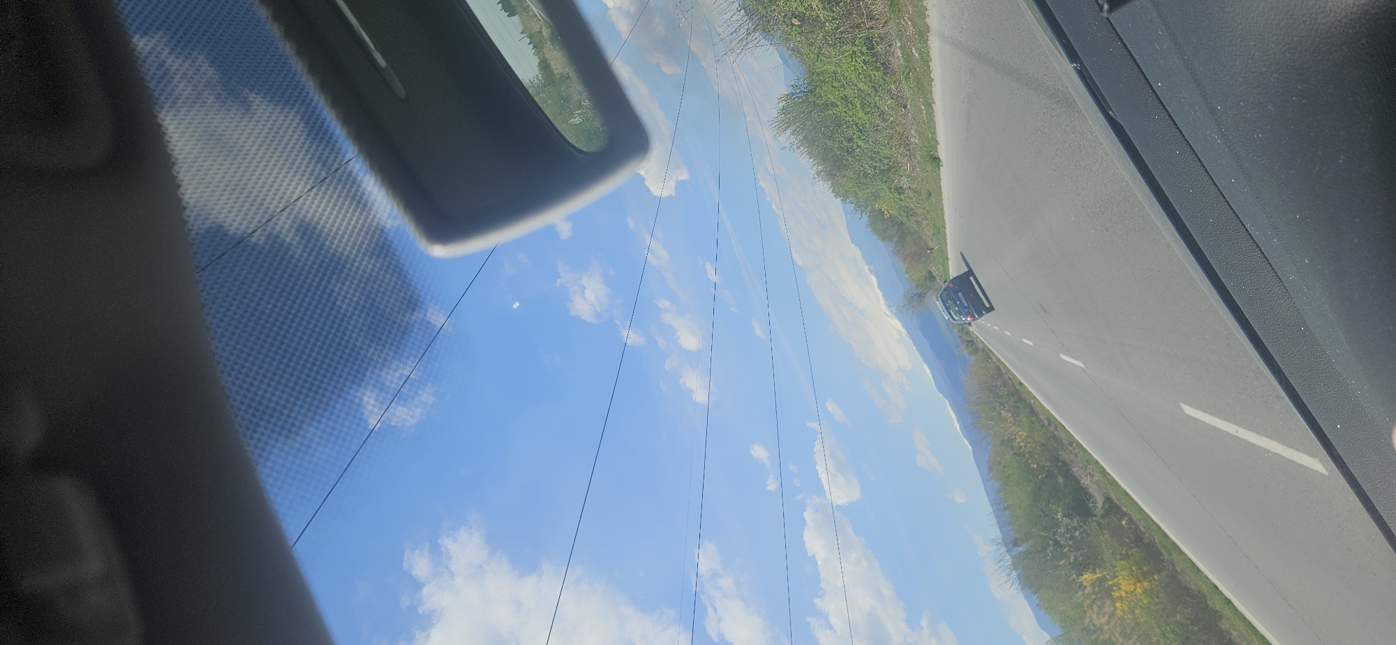 The image, taken from the interior of a vehicle, shows a road leading towards the horizon, potentially located in or near Kovachevo, Bulgaria. A second car is visible on the road ahead. Lush green vegetation borders the road, and power lines stretch across a bright blue sky with scattered clouds. Parts of the vehicle's interior, including the windshield and sun visor, are in view.