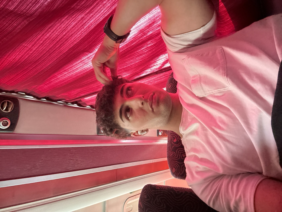 The image depicts a young adult male inside a passenger vehicle, likely a bus or coach, within the city of Kafr Sousa Municipality, Syria. The male, with dark, curly hair, is positioned facing slightly to his right, exhibiting a neutral expression with his eyes directed towards the right. He is wearing a light-colored, possibly white, short-sleeved t-shirt with a visible chest pocket on the left side. A white wireless earbud is present in his left ear. His right arm is bent, and his right hand is positioned with fingers touching his hair on the side of his head. A dark-colored wristwatch or fitness tracker is visible on his right wrist. The background features prominent reddish-pink lighting, particularly on the right side, illuminating a textured red curtain. To the left, light-colored overhead paneling is visible, including two circular air vents with adjustable controls. The subject is seated in a dark-patterned seat, part of which is visible behind him.
