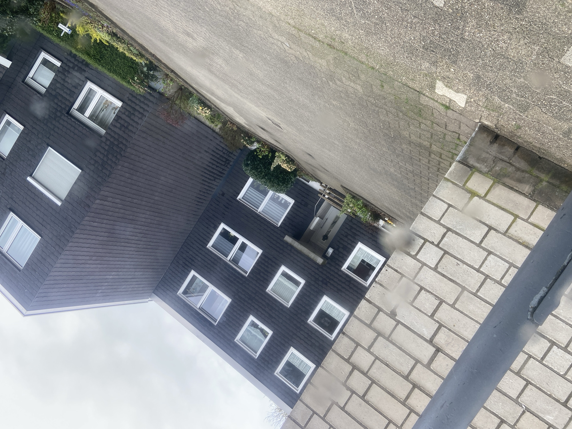 The image displays an oblique, slightly elevated exterior view of a multi-story residential building located in Gelsenkirchen, Germany, under an overcast sky. The building features a dark grey, likely tiled or shingled, facade with numerous white-framed windows. Some windows are equipped with light-colored external roller shutters, while others reveal internal blinds or curtains. A recessed ground-floor entrance, marked by steps leading to a white door, is centrally visible. Green shrubbery and garden plants adorn the building's base. A white sign with black text, "P Privatparkplatz," is partially visible within the foliage on the right side of the building. Adjacent to the structure is a paved surface, likely a private road or driveway, constructed from dark grey interlocking pavers, showing some lighter sections and minimal vegetative growth. A low wall composed of light-colored rectangular pavers occupies the lower-left foreground, partially obscured by a dark grey metal pole. No individuals or vehicles are present in the scene. Water droplets or streaks are visible on the camera lens, indicating condensation or precipitation.
