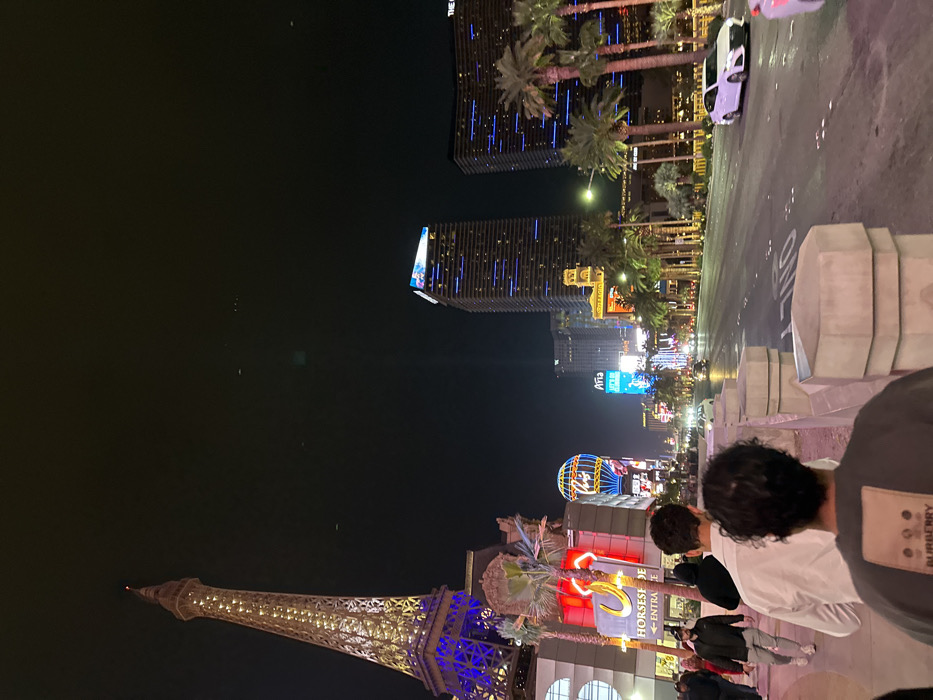 The image depicts a nighttime street scene in Paradise, United States. In the immediate foreground, three individuals are observed from behind, walking forward on a sidewalk. The closest person wears a dark short-sleeved shirt with a white "BURBERRY" logo visible on the back. To their left, another individual wears a white long-sleeved shirt, and further left, a person in a dark hoodie is partially visible among other pedestrians. On the left side of the scene, the illuminated Eiffel Tower replica stands prominently, glowing with gold and blue lights. Below it, the "Horseshoe" casino entrance is visible with prominent red signage and several palm trees. Further down the street on the left, an illuminated hot air balloon-shaped structure is present. A multi-lane asphalt road runs through the center of the image, with vehicles, including a white sedan, traveling away from the camera. On the right side of the road, numerous illuminated palm trees line the street, standing in front of several modern high-rise buildings. One building prominently displays the "Aria" logo, and another on the far right shows partial text for "THE CO...". Concrete barriers separate the sidewalk from the road on the right. The sky is dark, indicating nighttime conditions, with urban light pollution visible.