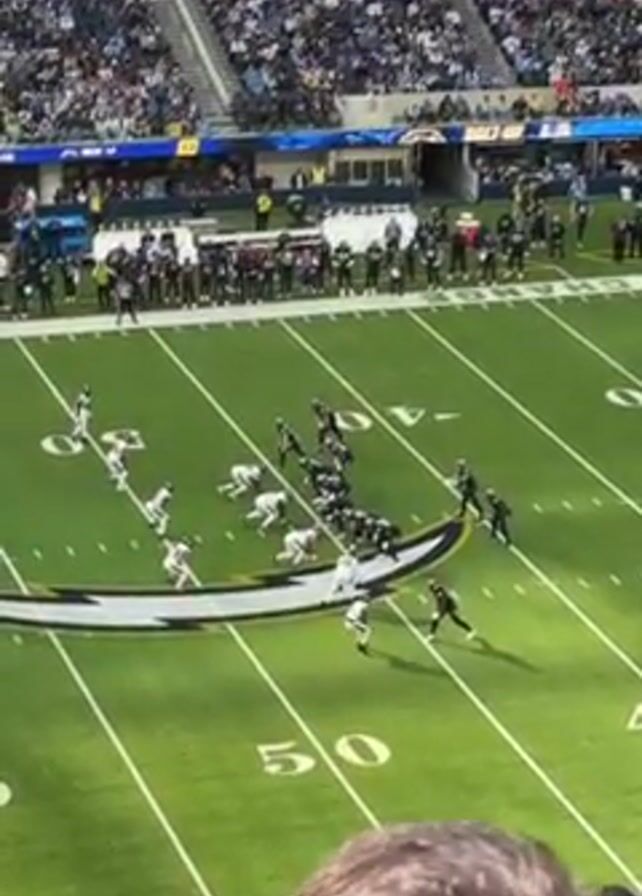 football game in progress from a high vantage point, likely within the stadium. The field is green with yard lines and markings. Players in both white and black uniforms are positioned on the field, seemingly mid-play. Spectators fill the stadium seats, with many wearing team colors. The day appears sunny. The focus is on the players and the ongoing play on the field.