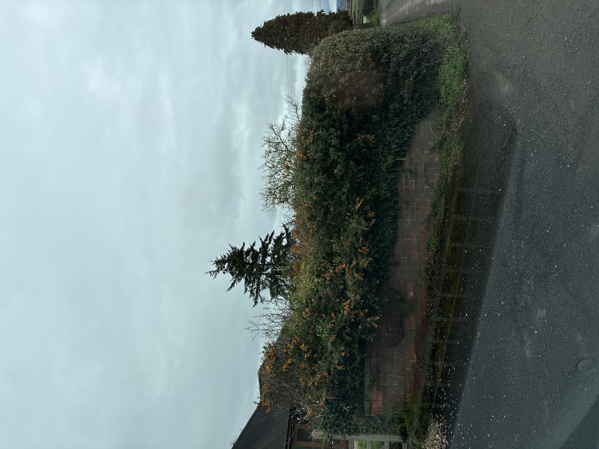 The image displays a rural road scene in the village of Pulverbatch, United Kingdom, under an overcast sky. In the foreground, a dark, granular asphalt road surface appears damp. A low brick wall, constructed from red-brown bricks and approximately three courses high, extends horizontally across the mid-ground. Dense green ivy covers sections of this wall and a wooden gatepost positioned on the far left. Above the brick wall, a thick, overgrown hedge dominates the mid-ground. This hedge features dark green foliage heavily laden with numerous clusters of bright orange berries. Behind the left portion of the hedge, part of a building is visible, characterized by a dark tiled roof and a wooden-framed window or door opening. Further back, slightly to the left of the center, a tall, dark conifer tree with a pointed crown stands prominently against the uniformly light grey, cloudy sky. To the right of the hedge, the asphalt road curves slightly and recedes into the distance. A green grass verge borders the road on this side. Another tall, dark evergreen tree with a conical shape is partially visible on the far right, beyond the hedge. Faint utility wires traverse the sky horizontally above the right side of the hedge. The background to the far right reveals a distant green, undulating landscape under the same cloudy conditions. No individuals, animals, or active interactions are present in the depicted scene.