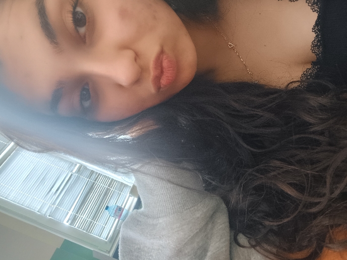 A female individual is depicted in an indoor setting, likely a room within a structure in Gorna Oryahovitsa, Bulgaria, though the precise location within the city cannot be determined from the image. The subject, a young adult female, is positioned in a close-up, eye-level shot, with her head and upper torso filling the frame. She has long, dark, wavy hair, dark eyes, and olive skin, with several visible blemishes on her right cheek. Her lips are pursed in a 'kissing' gesture, and she is looking directly at the camera. She is wearing a grey knitted sweater partially over her left shoulder and a black top with a lace-trimmed neckline visible on her chest. A thin, golden-colored chain necklace with small accents is worn around her neck. In the background, to the left and slightly behind her, a window fitted with horizontal white blinds is visible, allowing diffused light into the space. A blue and white plastic water bottle with a visible label rests on the windowsill or an adjacent surface. A light green wall section is visible to the far left of the window. The overall lighting is soft, originating primarily from the window.