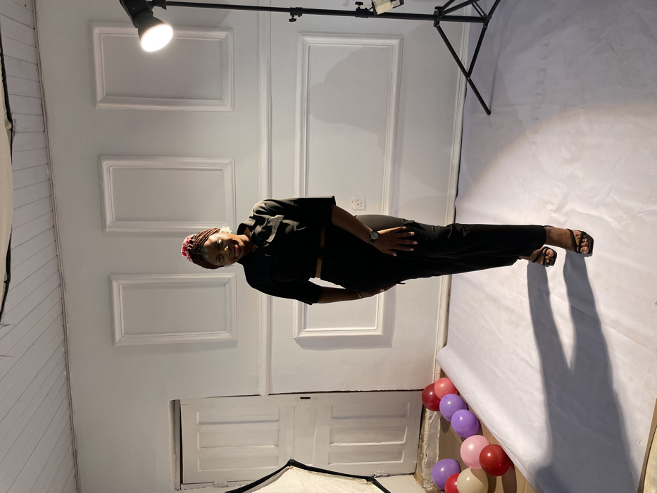 A woman in a black two-piece outfit stands in a white photo studio. She is wearing black heels and a watch. Her hair is styled with colorful decorations. The studio features white walls with decorative molding, a white floor cover, studio lighting equipment, and a white door. A group of red, pink, and purple balloons sit in the corner near the door.
