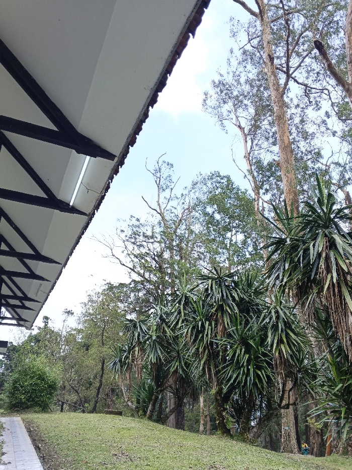 This image depicts a natural outdoor environment adjacent to a structural overhang in La Castellana, Philippines. On the left, a white building soffit with exposed dark brown support beams and a terracotta-tiled roof edge extends into the frame. Two linear fluorescent light fixtures are visible under the soffit. Below the overhang, a light-colored paved pathway, composed of square or rectangular tiles, runs horizontally and then slightly inclines to the left. The pathway borders a gently rising grassy slope that dominates the lower-middle and right sections of the image. In the midground, a cluster of plants with dense, spiky, dark green leaves, resembling Dracaena or Yucca species, are arranged on the slope. Behind these plants, a dense collection of tall trees with light-colored, slender trunks, possibly Eucalyptus, stand prominently. Further in the background, a variety of other trees with both green foliage and some bare branches are visible. The sky above is clear light blue with minimal cloud cover, indicating daylight. In the far lower right corner, partially obscured by trees, a human figure wearing yellow and green clothing is faintly visible, suggesting the presence of an individual within the natural setting. No specific actions or interactions are discernible from the individual's limited visibility.