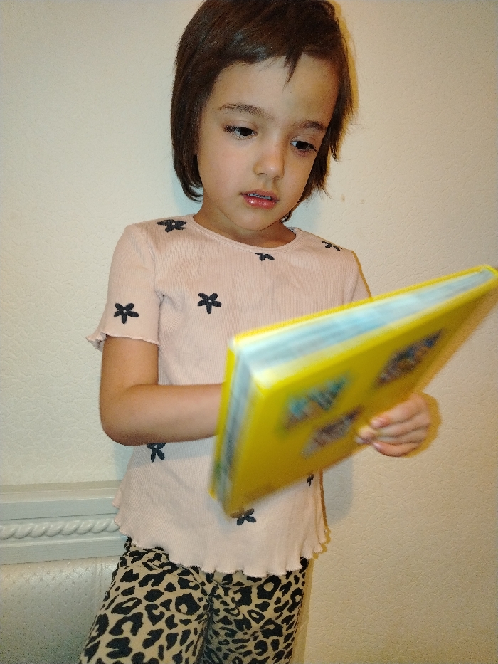 The scene depicts a young child, possibly female, standing indoors in the city of Noviy, Russia. The child has shoulder-length brown hair and is looking downwards, with a slightly parted mouth. She is wearing a light pink, short-sleeved top adorned with small black flower or star-shaped patterns and leopard-print pants in black and tan. She is holding an open book with a vivid yellow cover, with both hands positioned in front of her. The pages of the book display colorful, indistinct illustrations or text. The background consists of a plain, light-colored, textured wall. In the lower left quadrant, a portion of a light-toned piece of furniture with decorative carved trim and a perforated surface is visible.