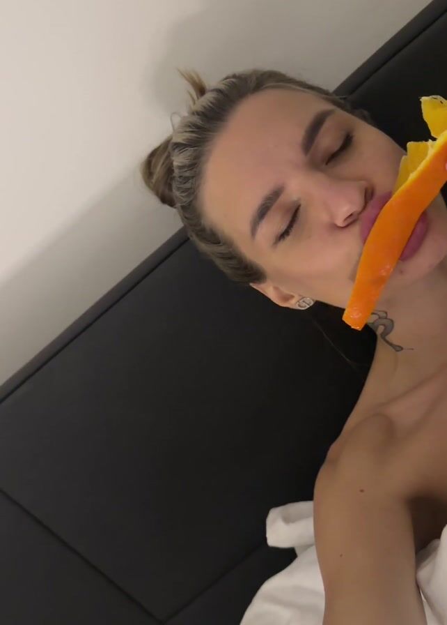 A woman is lying in bed with white sheets and a black headboard, holding an orange peel to her mouth. Her hair is up in a bun. She briefly puts the peel in her mouth, then pulls it out and holds it up.