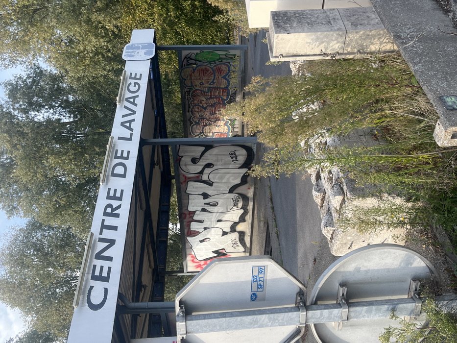 - "The image displays a disused outdoor car wash facility, identified by a white overhead canopy with the inscription "CENTRE DE LAVAGE" in black capital letters and a faded blue logo on the right side, located in Croix, France" by FM-NQrs03, licensed under CC BY 4.0