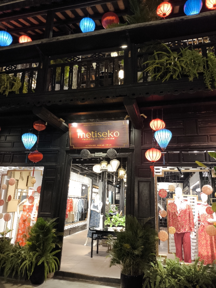 The image displays the illuminated facade of a two-story commercial building, identified as "metiseko" at 52 Trần Phú, Hội An Ward, Vietnam, during nighttime. The structure features dark wooden architecture with intricate carvings and railings. On the ground floor, a central open doorway serves as the main entrance, flanked by large glass display windows. The entrance area itself is brightly lit, revealing an interior with multiple mannequins displaying clothing, racks of garments, and various traditional-style lanterns suspended from the ceiling. A small, dark table is positioned near a female mannequin dressed in a blue patterned outfit inside the entrance. Potted ferns are placed on the sidewalk in front of the entrance. The left display window features a female mannequin in a long, patterned red and orange dress, set against a backdrop of rectangular panels and circular, woven decorative elements. Two lanterns, one blue and one red, hang vertically in front of this window. The right display window showcases two mannequins: one wearing a red patterned shirt and red pants, and another in a long, patterned red dress. These mannequins are surrounded by circular decorative items. Three lanterns, one blue and two red/orange, are vertically suspended in front of this window. A prominent rectangular sign above the main entrance reads "metiseko" in white capital letters on a reddish-brown background, with "INSPIRED BY TRADITION" and "52 TRAN PHU - HOI AN - VIET NAM" in smaller text below. The first floor features a balcony with dark wooden railings adorned with several large potted ferns. Numerous colorful lanterns, including blue, red, and orange, are suspended from the eaves above the balcony and along its structure. The overall scene is brightly illuminated by the shop's interior lights and the abundance of colorful lanterns, creating a vibrant, traditional nighttime streetscape. No individuals are visible in the image.