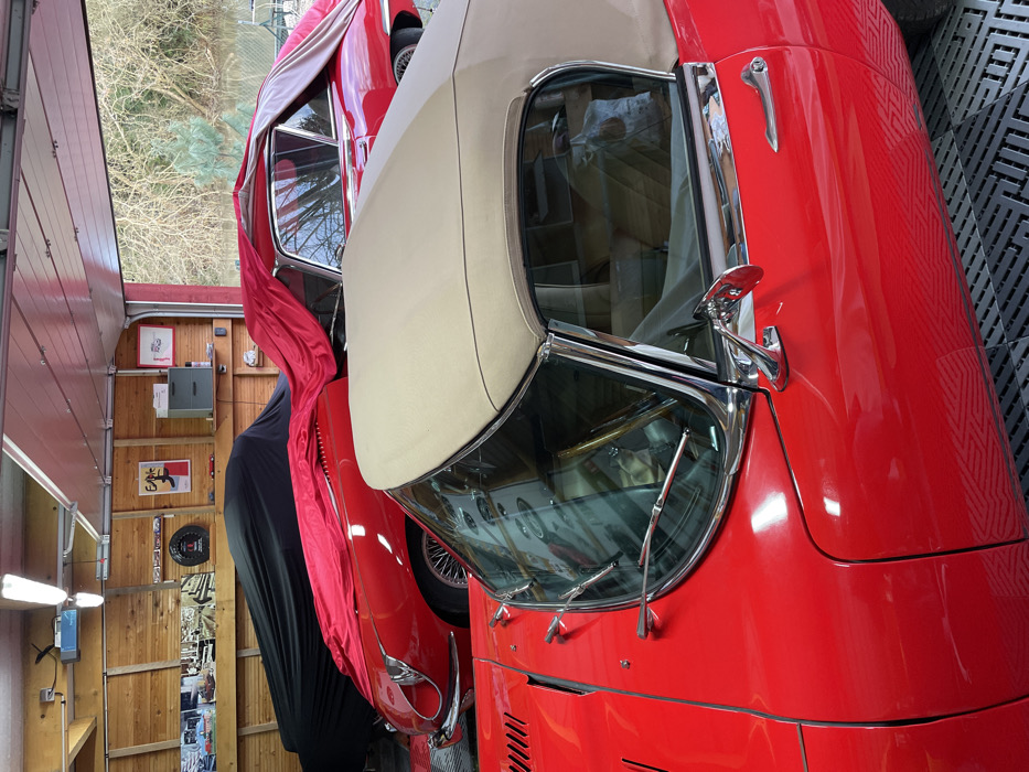 The image displays the interior of a garage or car storage facility located in Vierzon, France, containing three classic automobiles. In the immediate foreground, a bright red Jaguar E-Type Series 1 Roadster is prominent, featuring a raised beige canvas soft top, chrome windshield trim, two windshield wipers, and chrome side mirrors. Its interior, visible through the glass, includes a wooden steering wheel and light-colored upholstery. Immediately behind and to the left of the roadster is a red Jaguar E-Type Fixed-Head Coupe, partially covered by a red fitted car cover that drapes over its front and rear, revealing some red bodywork and a chrome wire wheel. Further in the background, a third vehicle, fully enveloped in a form-fitting black car cover, is visible. The garage features light-colored horizontal wood paneling on the walls and a white paneled ceiling with two linear fluorescent light fixtures. The floor is covered with dark grey interlocking modular tiles. The rear wall displays various framed artwork and photographs, including a poster with "EATON" branding, and a grey two-drawer storage cabinet. An open section or large window at the rear of the garage reveals an exterior scene with bare trees on a bank, overlooking a body of water, possibly a river or canal. No individuals are present in the scene.