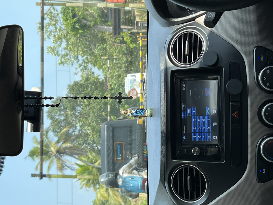 The image depicts a static scene observed from the interior of a vehicle, positioned at a railway crossing in Andhakaranazhy, India. The time displayed on the vehicle's infotainment system is 10:23 AM. In the foreground, the vehicle's dark grey dashboard is visible, featuring a central infotainment system displaying a Bluetooth dial pad interface. Circular air vents are located on either side of the console, with a hazard light button and two circular magnetic phone mounts below. A small, multi-colored figurine of the Virgin Mary, wearing a blue robe and holding hands over her heart, rests on the dashboard. A dark rosary with a crucifix hangs from the rearview mirror, beneath which a dashcam is mounted. Part of the steering wheel is visible on the far right. Beyond the windshield, a black and yellow striped railway crossing barrier is partially lowered, obstructing the road. A person wearing a dark helmet and a blue backpack is seated on a red motorcycle, positioned to the left of the frame and facing away from the camera, stopped before the barrier. Behind the motorcycle, a dark three-wheeled auto-rickshaw or similar vehicle, bearing "PIAGGIO" and "VIAGGIO" text on its rear, is also halted. A white vehicle and a red "STOP" sign are partially discernible to the right, behind the barrier. The background consists of abundant green foliage, including several palm trees, under a clear, bright blue sky. A utility pole stands on the left side of the scene.