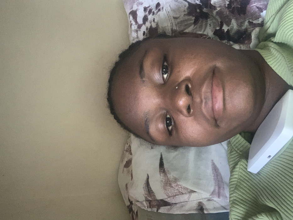 An individual of African descent, appearing female, is depicted in a close-up, head-and-upper-torso shot, lying down indoors