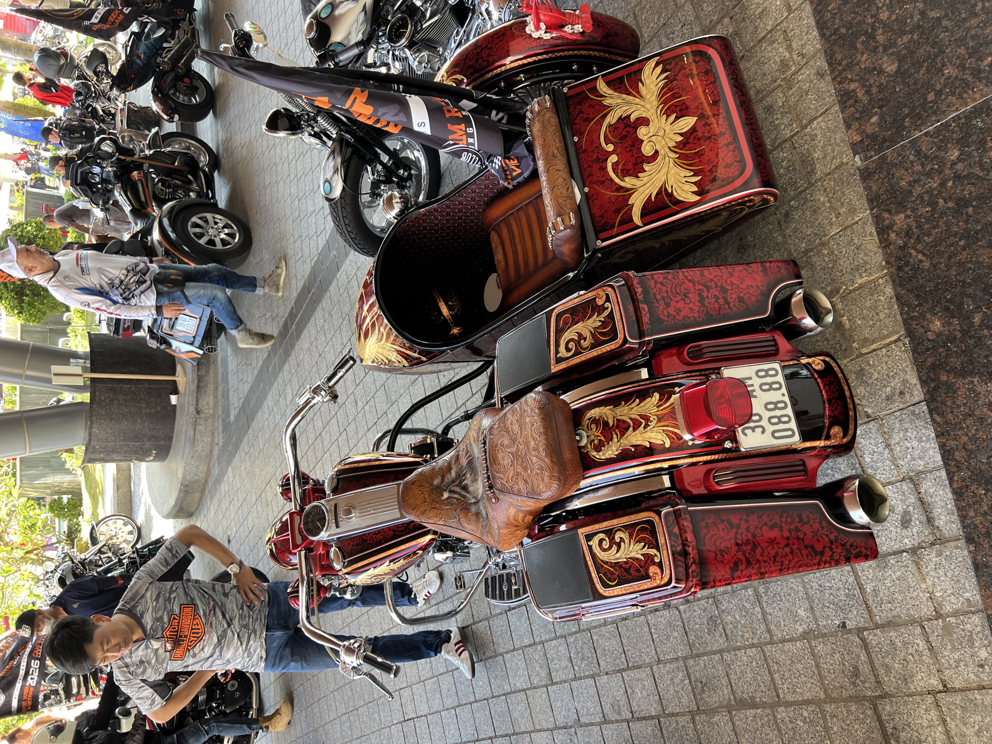 The scene depicts an outdoor gathering featuring custom motorcycles in Cam Ranh, Vietnam, specifically within a paved plaza or forecourt of a building, indicated by a partially visible banner stating "BIKE WEEK VIETNAM 2026 CAM RANH." In the foreground, a highly customized motorcycle with an attached sidecar is prominently displayed. Both the motorcycle and sidecar feature a glossy red and black paint scheme adorned with intricate gold filigree and scrollwork patterns. The motorcycle's saddle and the sidecar's interior seat are crafted from brown leather with detailed embossed tooling. Chrome accents are visible on the handlebars, engine components, and exhaust pipes. A Vietnamese license plate, "30 AM 088.88," is affixed to the rear of the motorcycle. A small red plastic lobster figurine is attached to the front right side of the sidecar. To the left of the custom motorcycle, a male individual, appearing East Asian, stands with his hands on his hips, looking down at the motorcycle. He is wearing a grey camouflage-patterned short-sleeve t-shirt with an orange "HARLEY-DAVIDSON CYCLES" logo, blue jeans, and white sneakers with red stripes. A wristwatch is visible on his left wrist. In the mid-ground, a male individual, appearing Caucasian, walks from right to left. He is dressed in a white long-sleeved shirt with graphic designs, a white baseball cap, blue jeans, and light-colored sneakers, and carries a small pouch on his hip. The background reveals several other motorcycles, including a black Harley-Davidson trike and other touring bikes, parked on the light grey tiled pavement. One black motorcycle in the mid-ground has a black flag with orange text and a skull logo attached to its rear. The environment includes large grey columns and some green foliage, suggesting an outdoor or semi-outdoor covered area of a building. The ground is a mix of light grey rectangular tiles and a darker, speckled brown tiled section in the immediate foreground. The lighting indicates bright daylight.