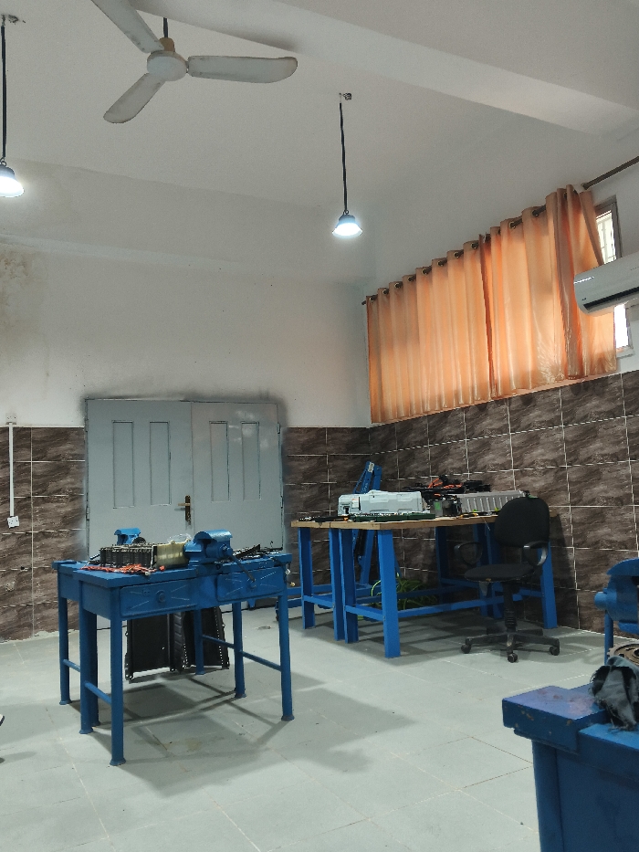 The image displays an indoor technical workshop or laboratory located in the city of طبقة فحل, Jordan