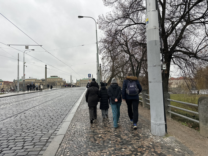 The scene depicts an outdoor urban environment on the Mánes Bridge in Prague, Czechia, under an overcast sky. Four individuals are walking away from the camera on a wet, cobblestone sidewalk located on the bridge's right side. All individuals are dressed in winter coats; one person wears patterned blue and white pants, and another carries a dark blue backpack with an Under Armour logo. A tall grey utility pole is positioned to the right of the walking individuals, adjacent to a metal pedestrian railing. Beyond the railing, a dirt path and a grassy area with bare deciduous trees are visible. To the left, the cobblestone roadway features two sets of tram tracks and overhead electrical wires supported by multiple poles. In the background, the Rudolfinum building, identifiable by its green dome and classical facade, is prominently visible along with other distant structures and additional pedestrians on the bridge.