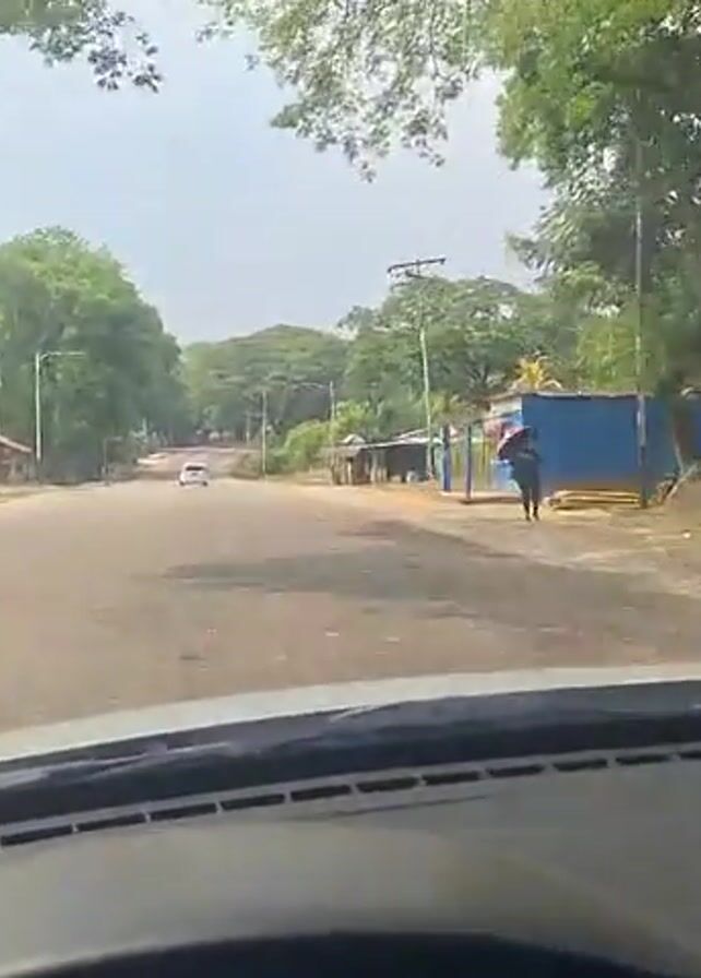 view from inside a car, looking out onto a somewhat rural road. The road is paved, but the shoulder appears to be dirt and gravel. There are houses and small buildings on either side of the road, and lush green trees line the roadside. A person stands under the awning of a blue building on the right side of the road. Another car, a white SUV, passes the camera vehicle. The sky is overcast, suggesting it's either early morning or a cloudy day. The camera is static, providing a driver's perspective.