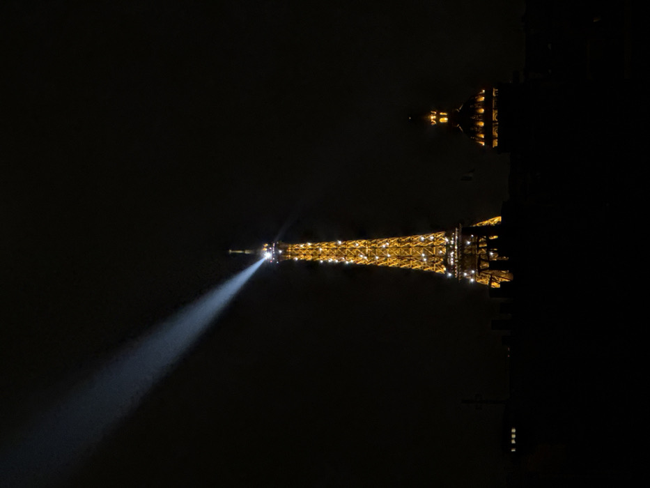This nighttime image depicts the illuminated Eiffel Tower in Paris, France, positioned centrally against a dark sky. The tower is bathed in golden-yellow lights, with numerous individual lights visible along its structural framework. A powerful white searchlight emanates from the tower's pinnacle, casting a distinct beam diagonally upwards and to the left into the dark atmosphere. To the right of the Eiffel Tower, a smaller, domed building with multiple illuminated windows and architectural details is visible, suggesting another significant Parisian landmark like Les Invalides. The foreground features a dark silhouette of city rooftops and structures, with faint lights visible in some windows on the far left. The overall scene is devoid of discernible human figures or specific actions, emphasizing the iconic illuminated landmarks against the darkness.